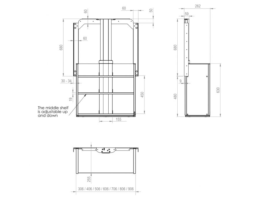 - Pour les armoires de plus de 700 mm de hauteur, une étagère fixe est montée au-dessus de l’élévateur