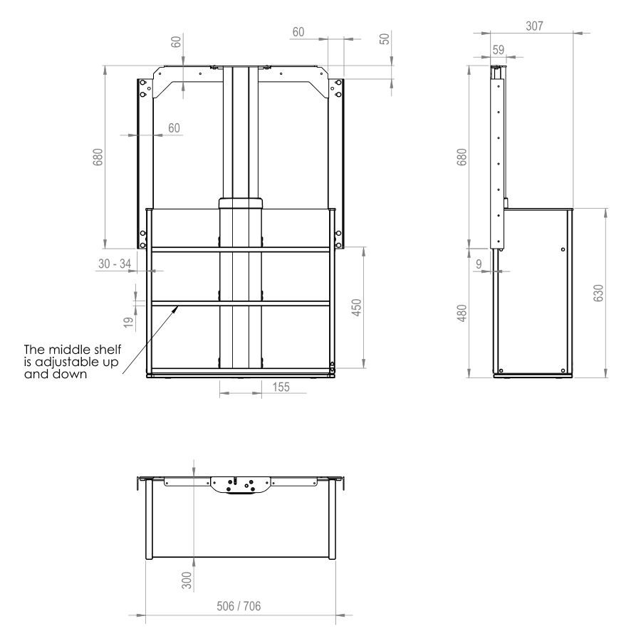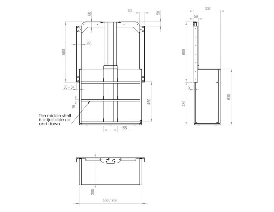 - Pour les armoires de plus de 700 mm de hauteur, une étagère fixe est montée au-dessus de l’élévateur